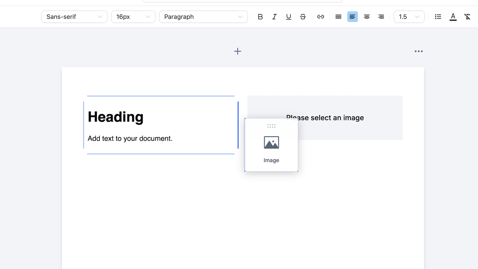- Drag an element (such as text, an image, or a table) next to another element in the document editor to create a split column layout.