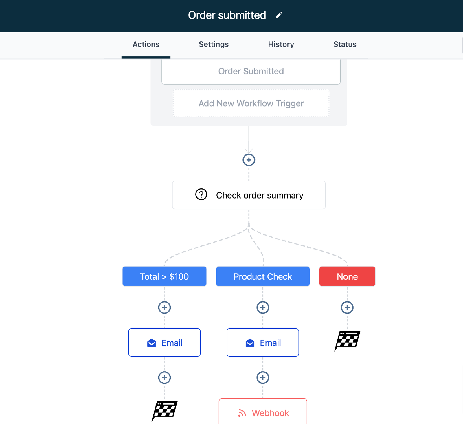 • Use conditions related to order details or product details in the If branches to direct the workflow based on the cart value/products purchased/funnel