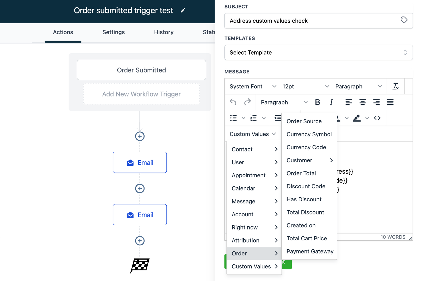 • Ability to use order-related custom values inside the workflow. This contains custom values related to customers, order details, coupon information, and payment gateway
