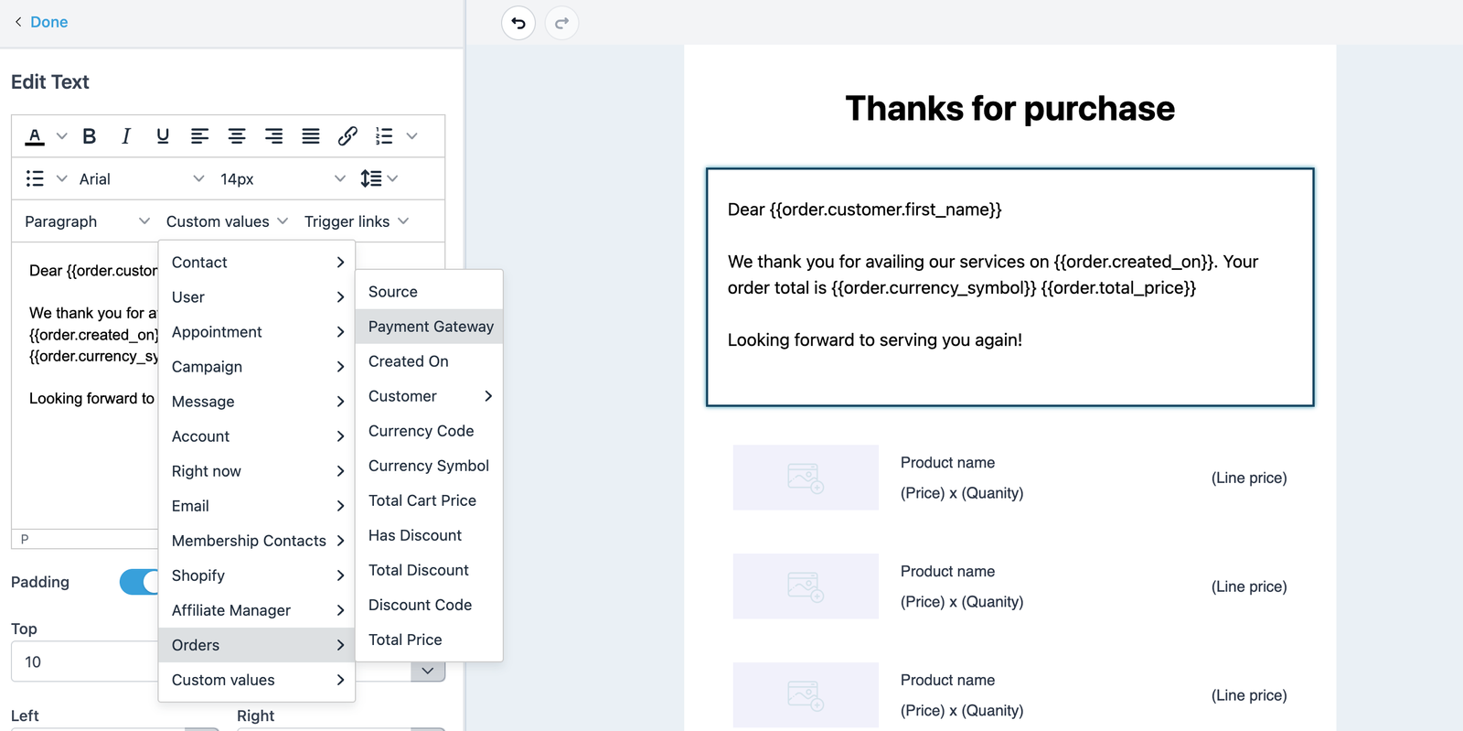 The products purchased by a client can be populated using the Shopping Cart element on an email builder template and using that specific template to send out a confirmation email to the end customer. The Shopping Cart element will auto-populate the product line items along with the purchased quantities, product images, and line item prices.