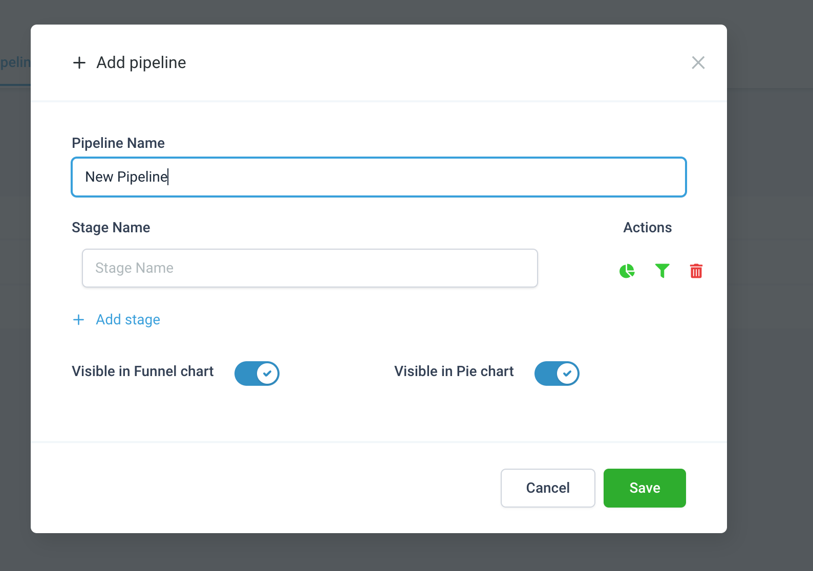 • The funnel and pie chart options allow you to decide whether the pipeline should be shown in the dashboard or not