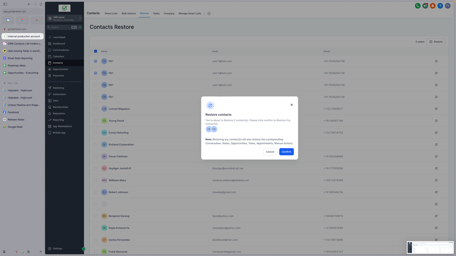 Step 2: Click on Confirm to restore all of these contacts and their related Opportunities, Conversations, Notes, Tasks, Appointments and Manual Actions