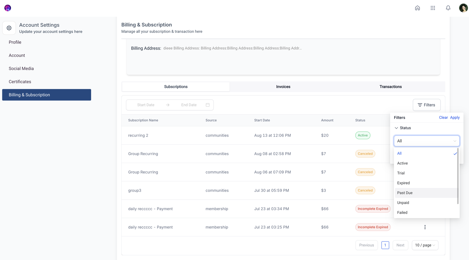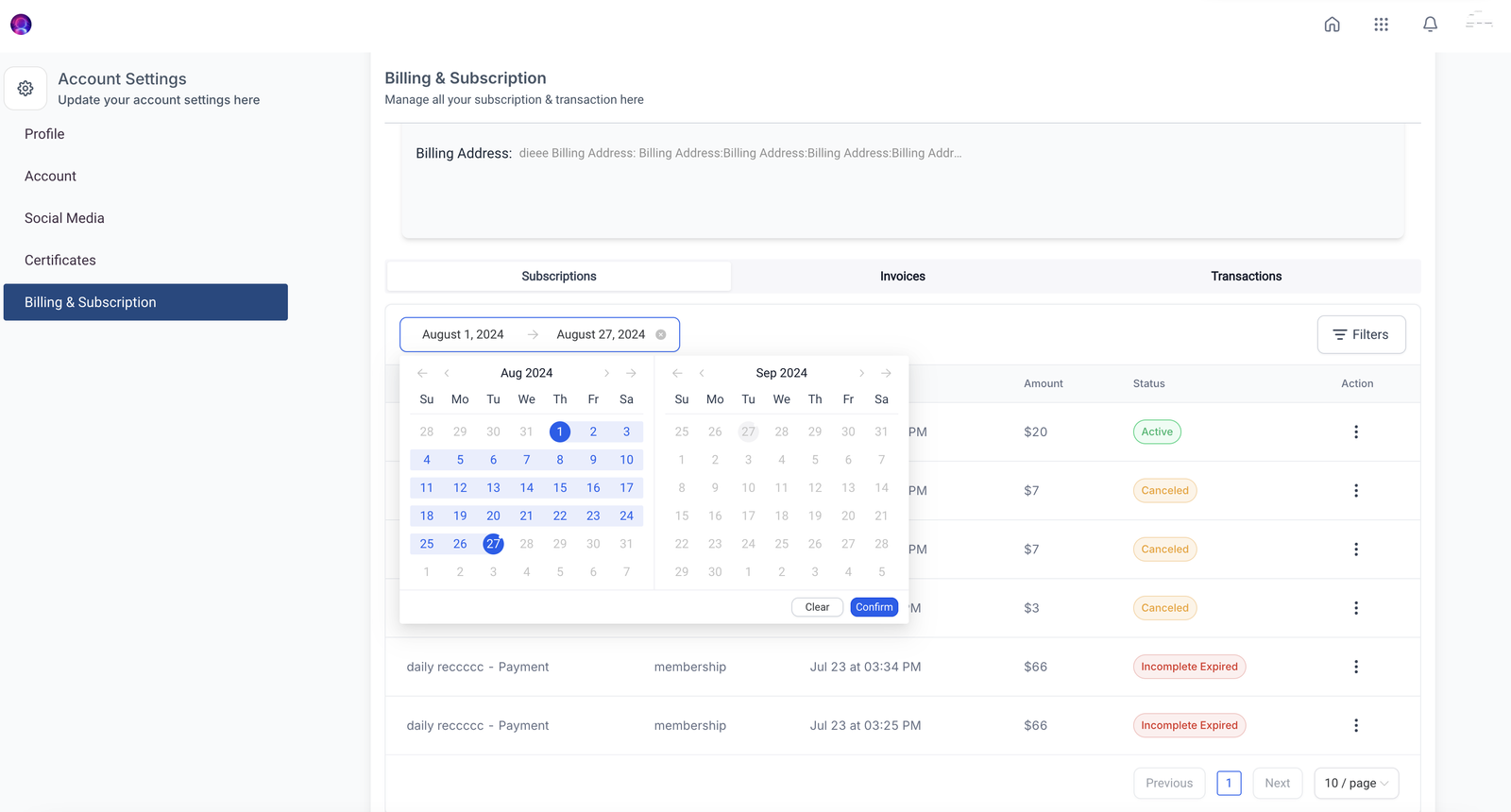 Quickly find subscriptions and transactions using advanced filtering options. You can filter by source, status, or a specific date range, helping you stay organized and providing a clear overview of your billing history.