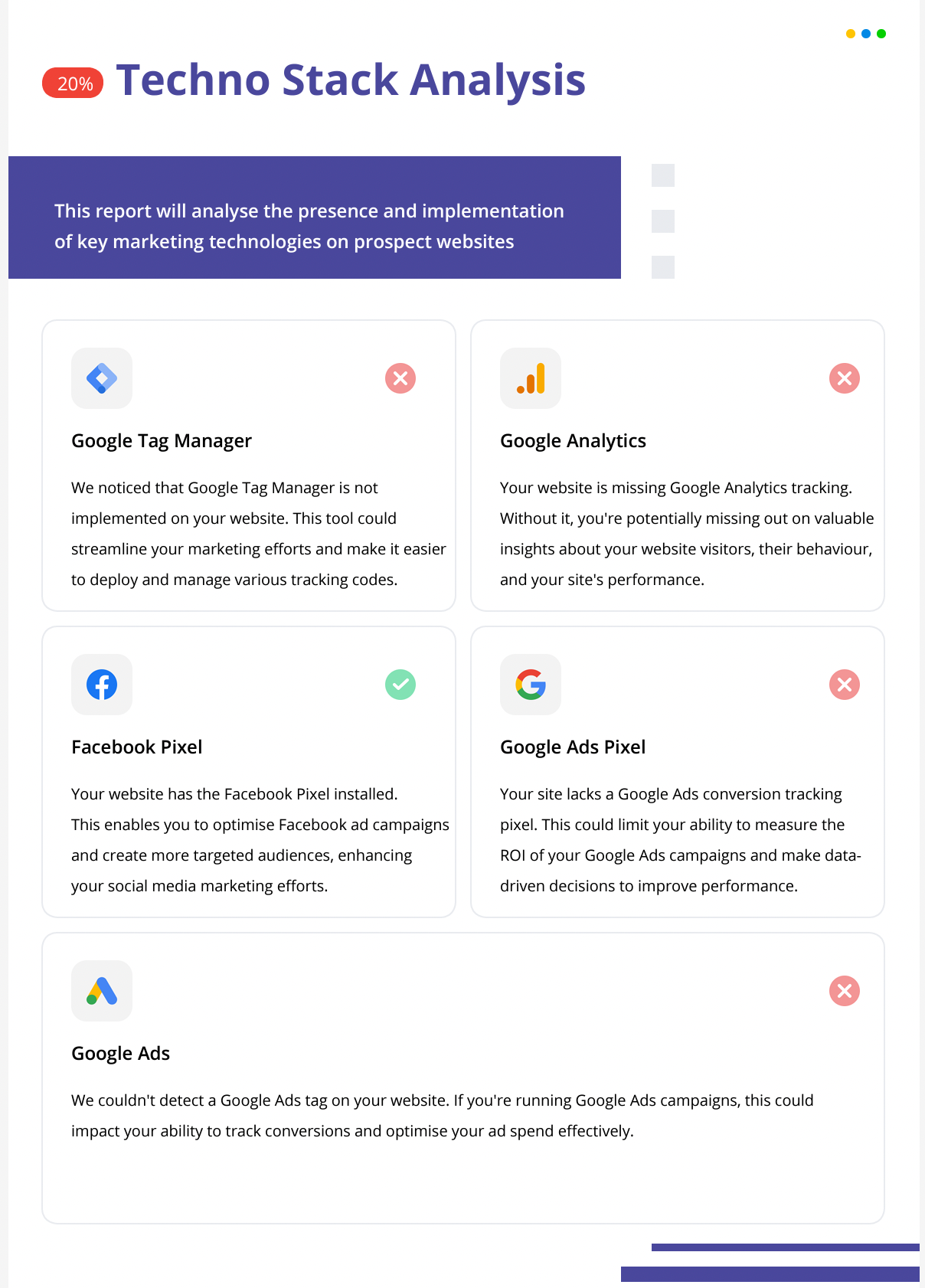 Technostack Analysis is a detailed assessment of a prospect’s digital marketing infrastructure. It examines the integration and use of key marketing technologies on their website, such as tracking pixels and tags from platforms like Facebook, Google Ads, Google Analytics, and Google Tag Manager.