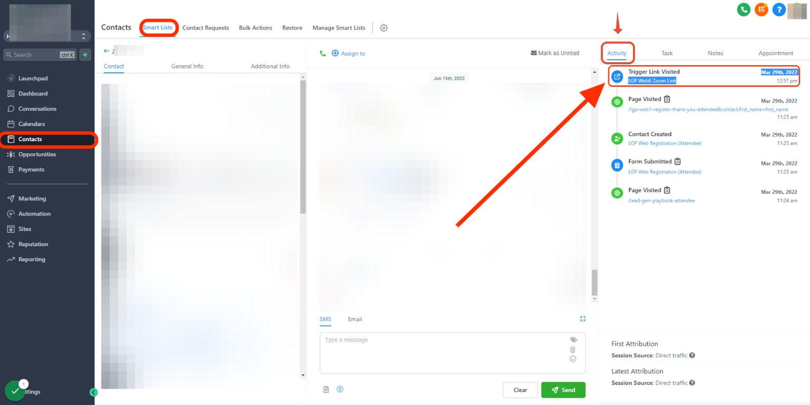 Click on contacts > Smartlist > search for the contact > Click on ‘activity‘