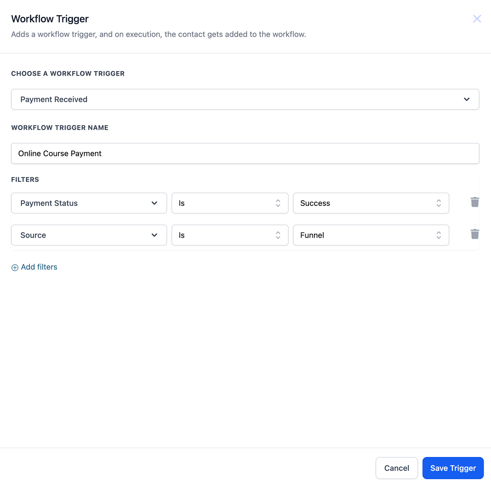 • Once you have configured your trigger and added any necessary filters, save and activate the workflow to start automating your payment-based processes.