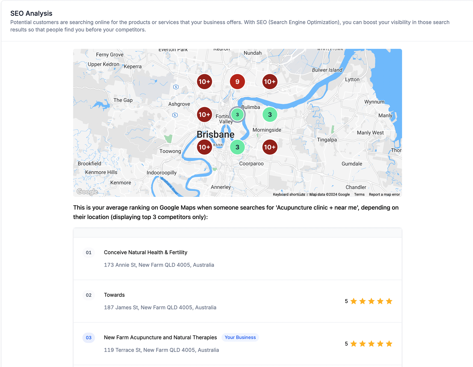 • The SEO Analysis section provides a detailed overview of the prospect’s search engine optimisation (SEO) performance. This includes a heat map comparison of business rankings in neighbouring locations compared to competitors. By visually representing SEO effectiveness through heat maps, users can identify areas of strength and opportunities for improvement to enhance local search visibility.