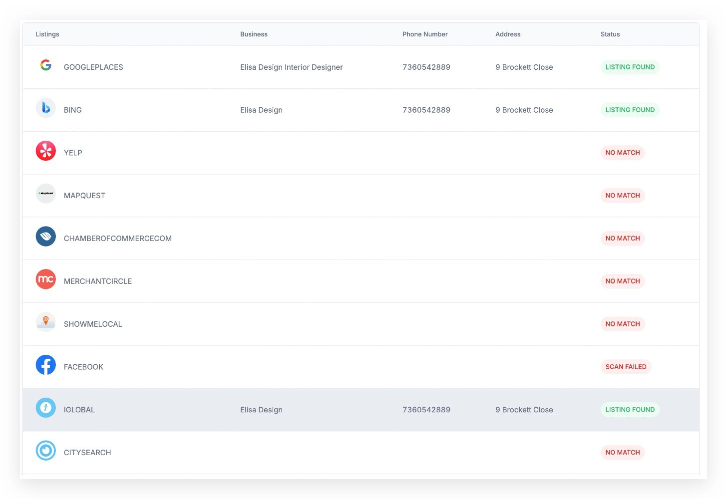 • The Business Listings section offers a comprehensive view of the prospect’s visibility across popular listings and directories. It highlights where the business is discoverable by end users, aiding in assessing online presence.