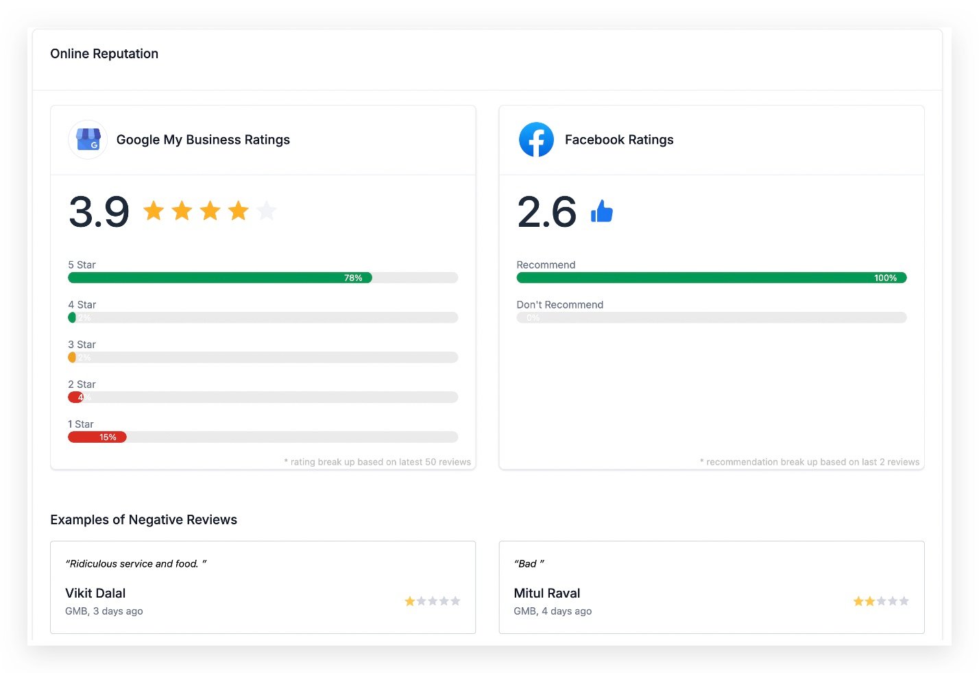 • This section analyses and presents insights into the Facebook and Google Business Profile (GBP) reviews of the prospect’s business. It provides an overview of customer sentiment and reputation across these platforms.