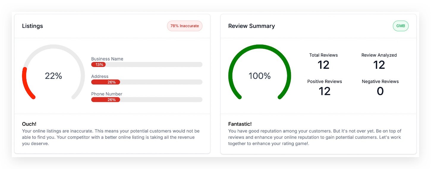• The SEO Analysis feature provides a visual representation of your prospects’ search engine performance compared to competitors, using heat maps. This allows your agency to identify strengths and areas for improvement, ultimately helping you enhance your clients’ local search visibility and optimize their SEO strategies.