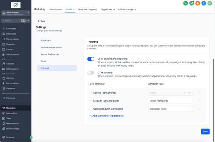 - Review Tracking Options: Click on the Tracking option to review the default UTM parameters.
