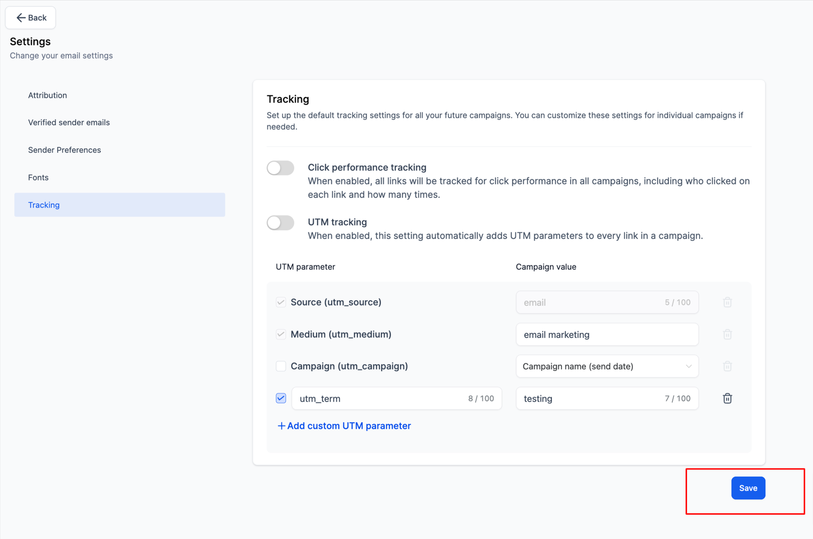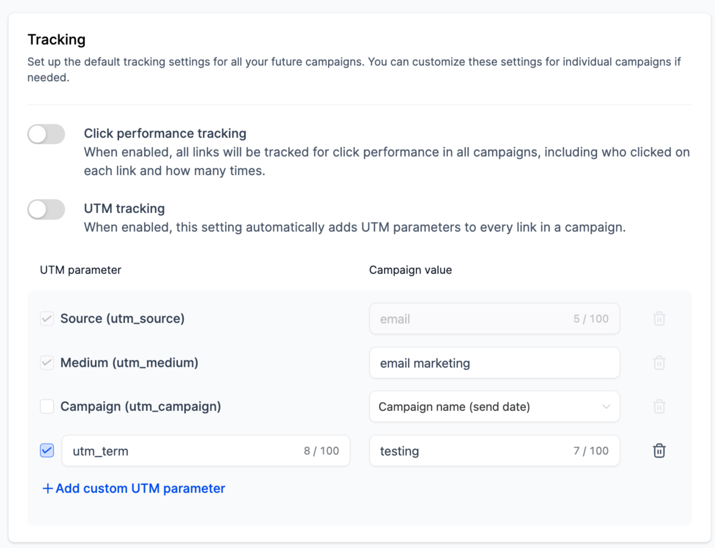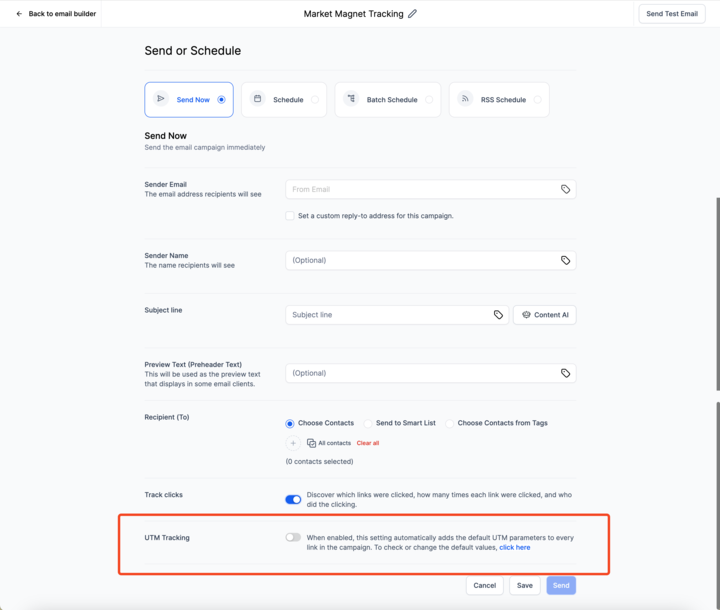 Disable for Specific Campaigns: To disable UTM parameters for a particular campaign, turn off the tracking option on the Send or Schedule page.