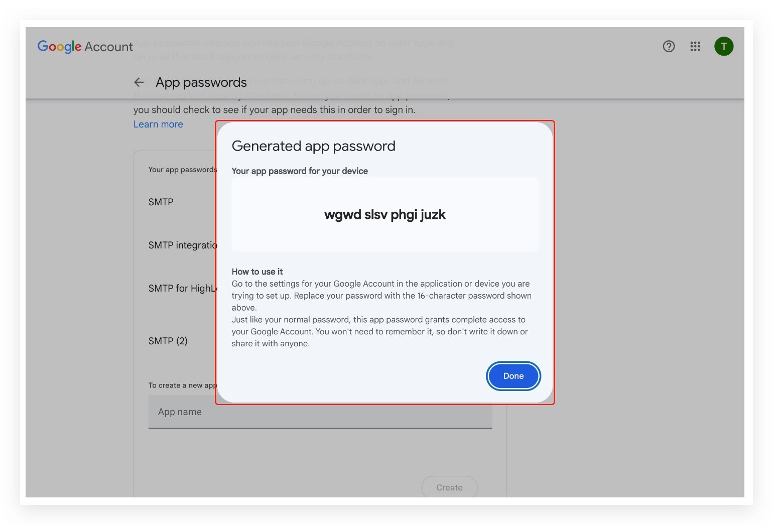 10. Drag to copy the app password and paste it as the password when integrating Gmail SMTP