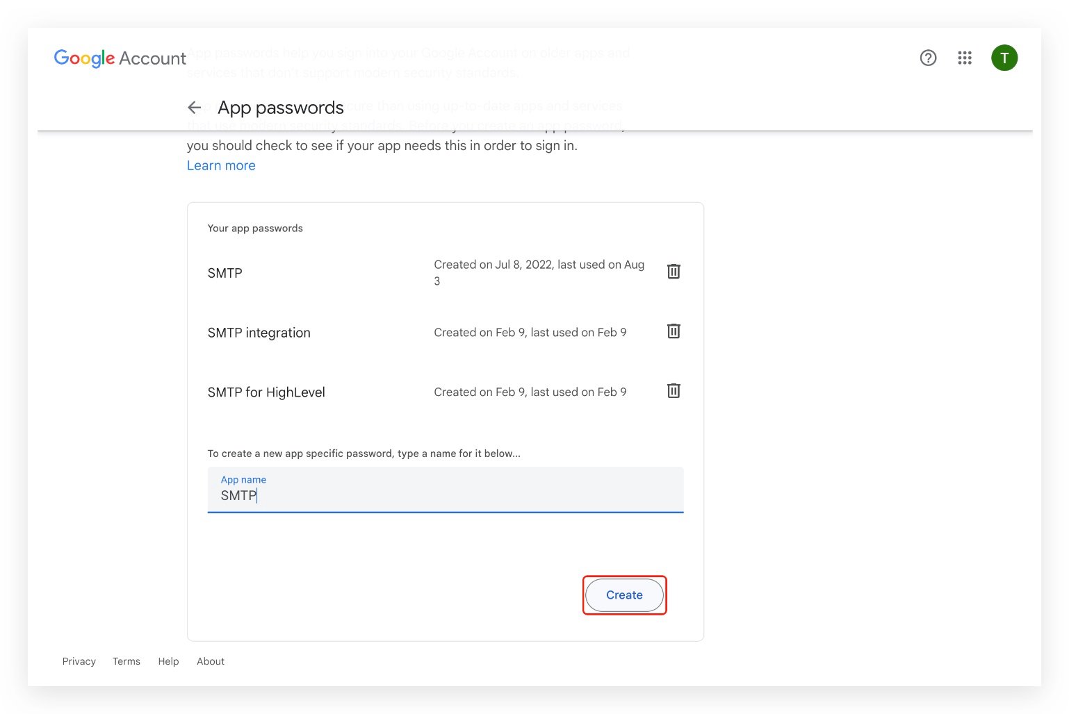 9. Type an App Name, e.g. SMTP integration > Click on Create