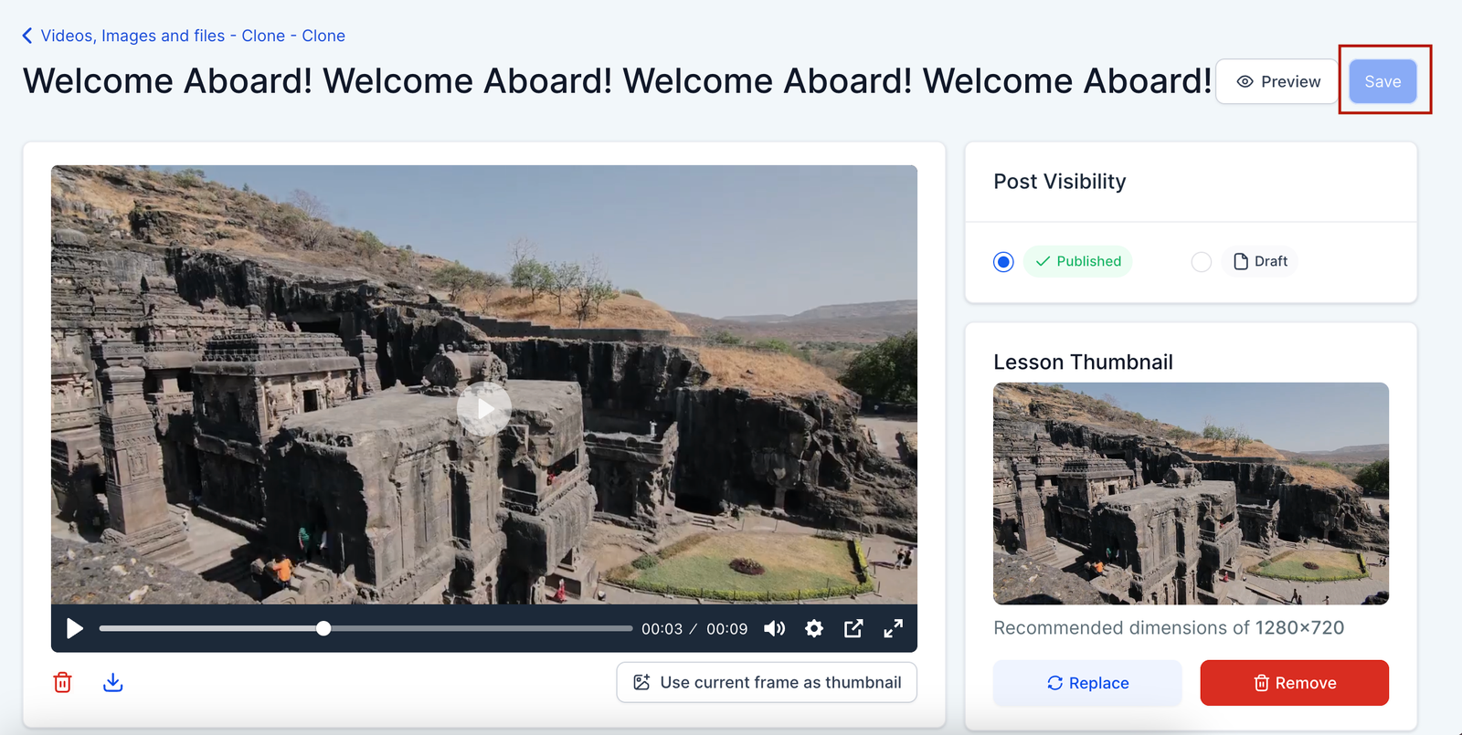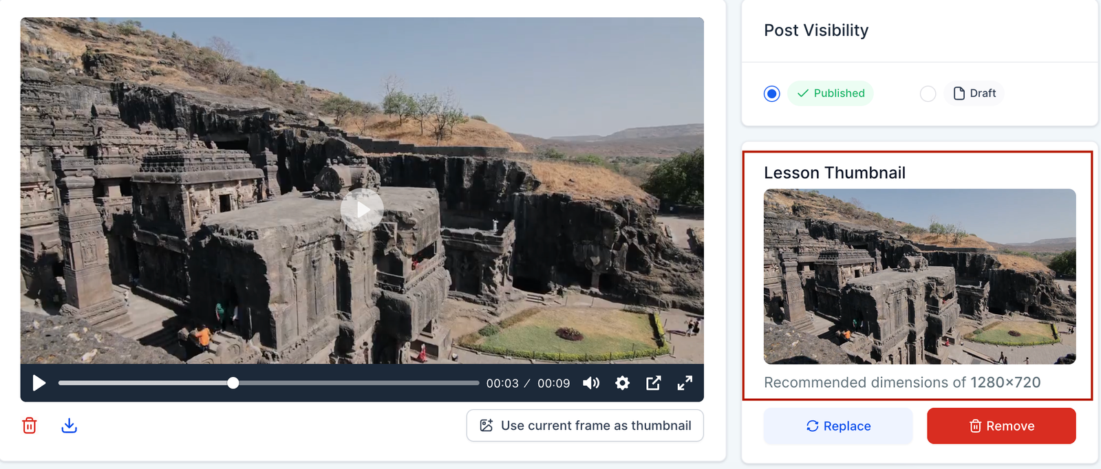 Step 3: After clicking on “Use current frame as thumbnail” the thumbnail will appear on lesson thumbnail