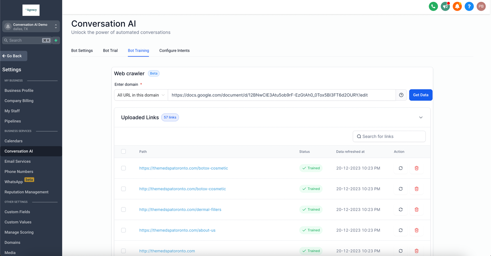 Trained URLs can be refreshed (retrains the bot on the latest information) or deleted (information will be removed from the bot’s knowledge base)