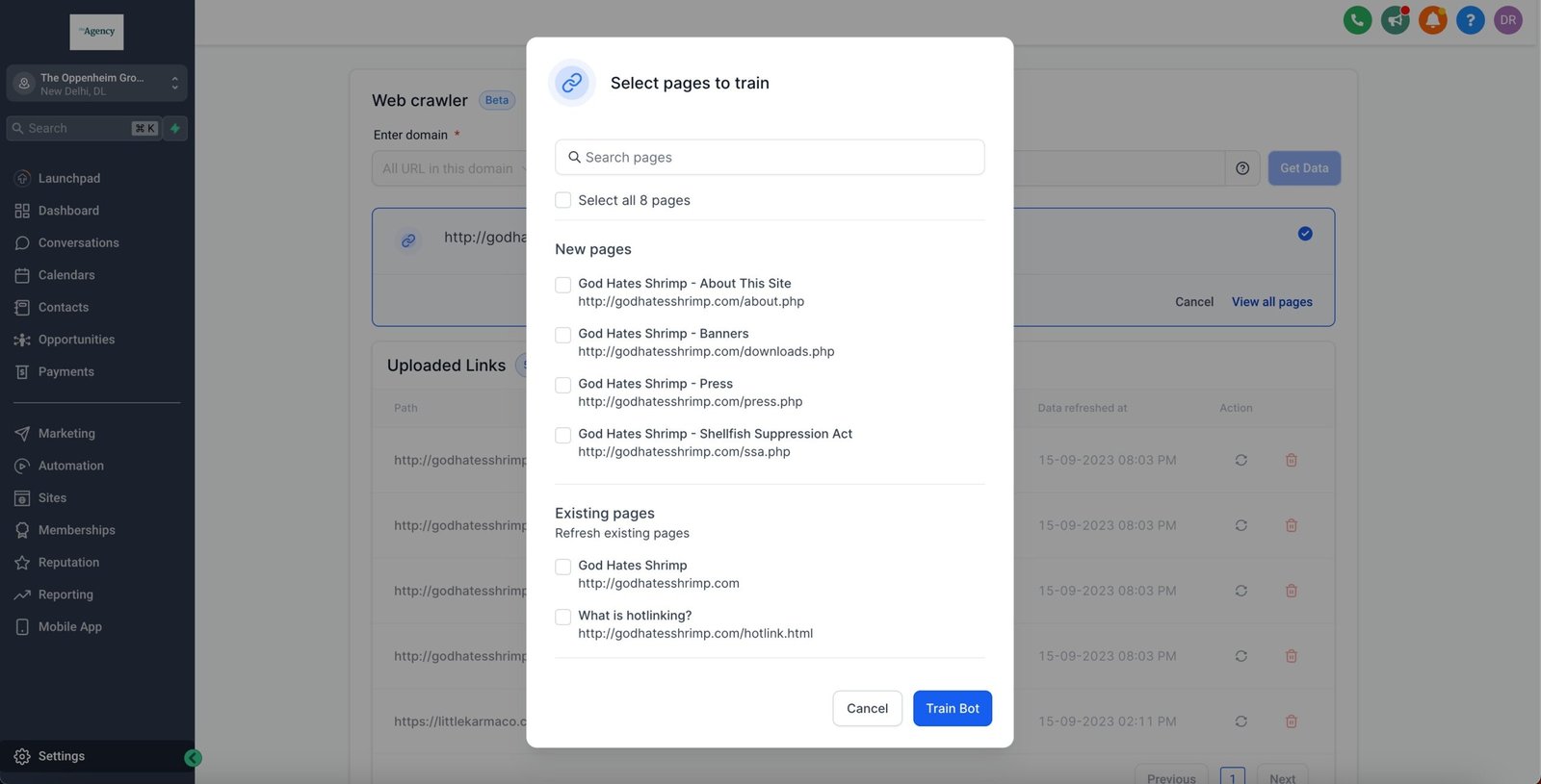 - Choose the pages that will be relevant to training the bot and hit “Train Bot.”