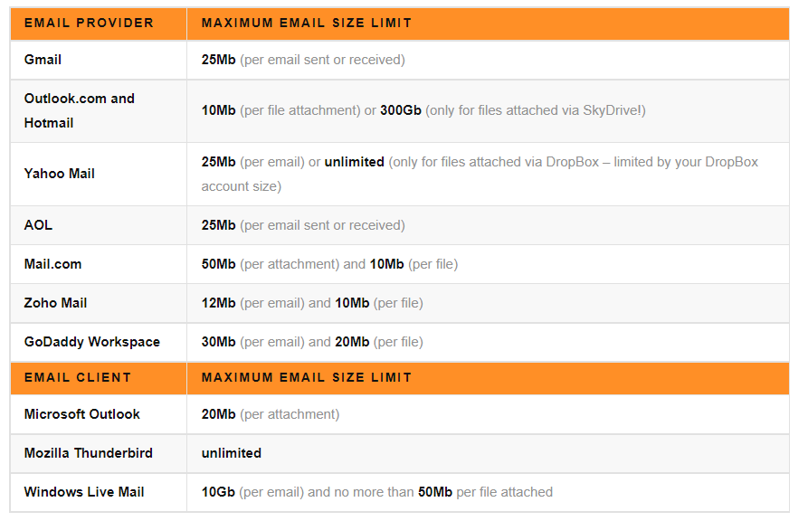 Here are the Carrier Attachment Size limits for some common US Carriers: