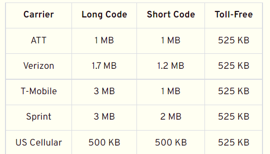 Carriers also have limits. The average is 300kb-600kb and can go up to 3.5MB for tier 1 providers (AT&T/Verizon, etc.)
