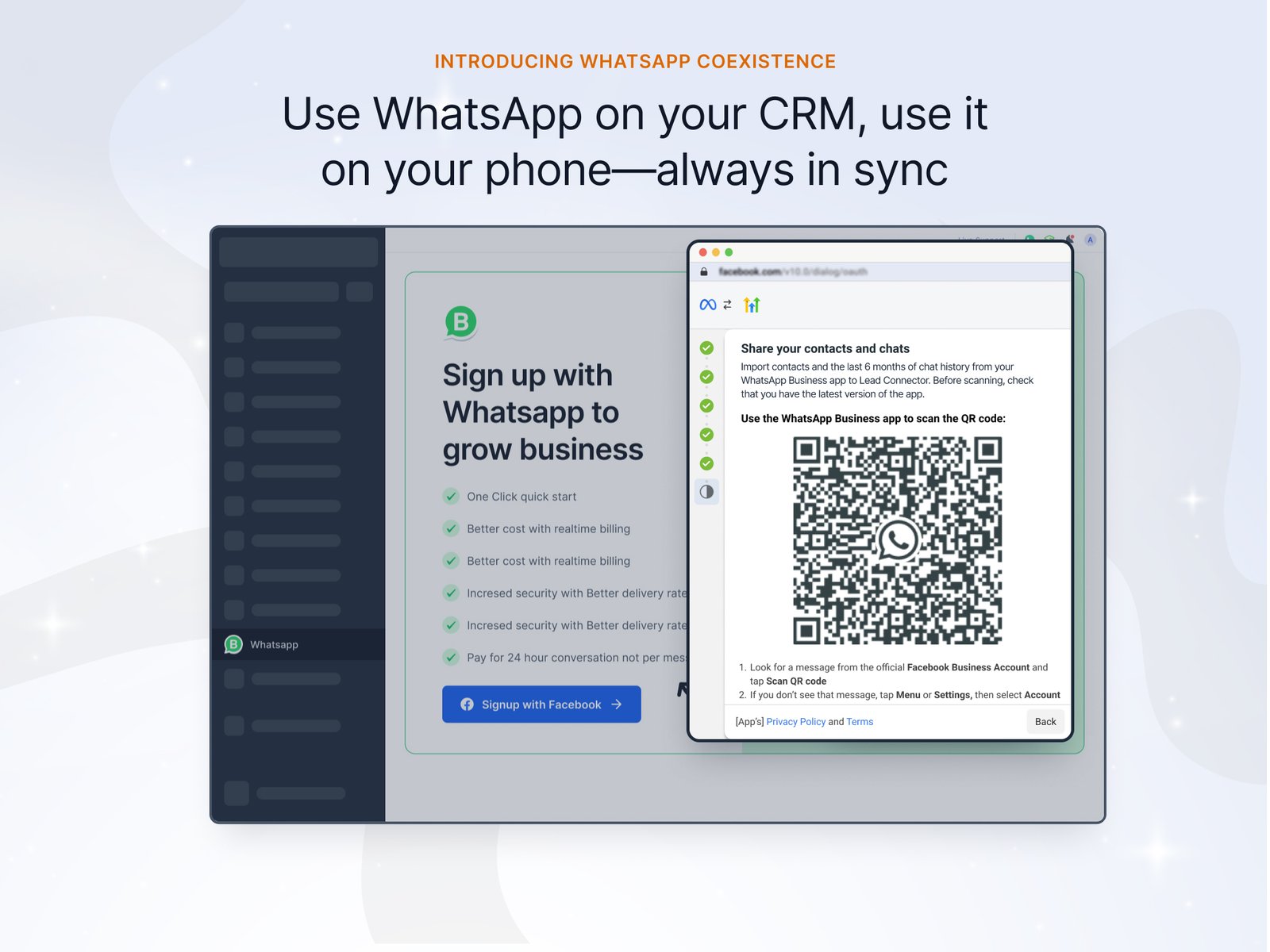 The WhatsApp Coexistence feature allows businesses to use their existing WhatsApp Business App account with LeadConnector’s advanced CRM tools powered by WhatsApp Cloud API.