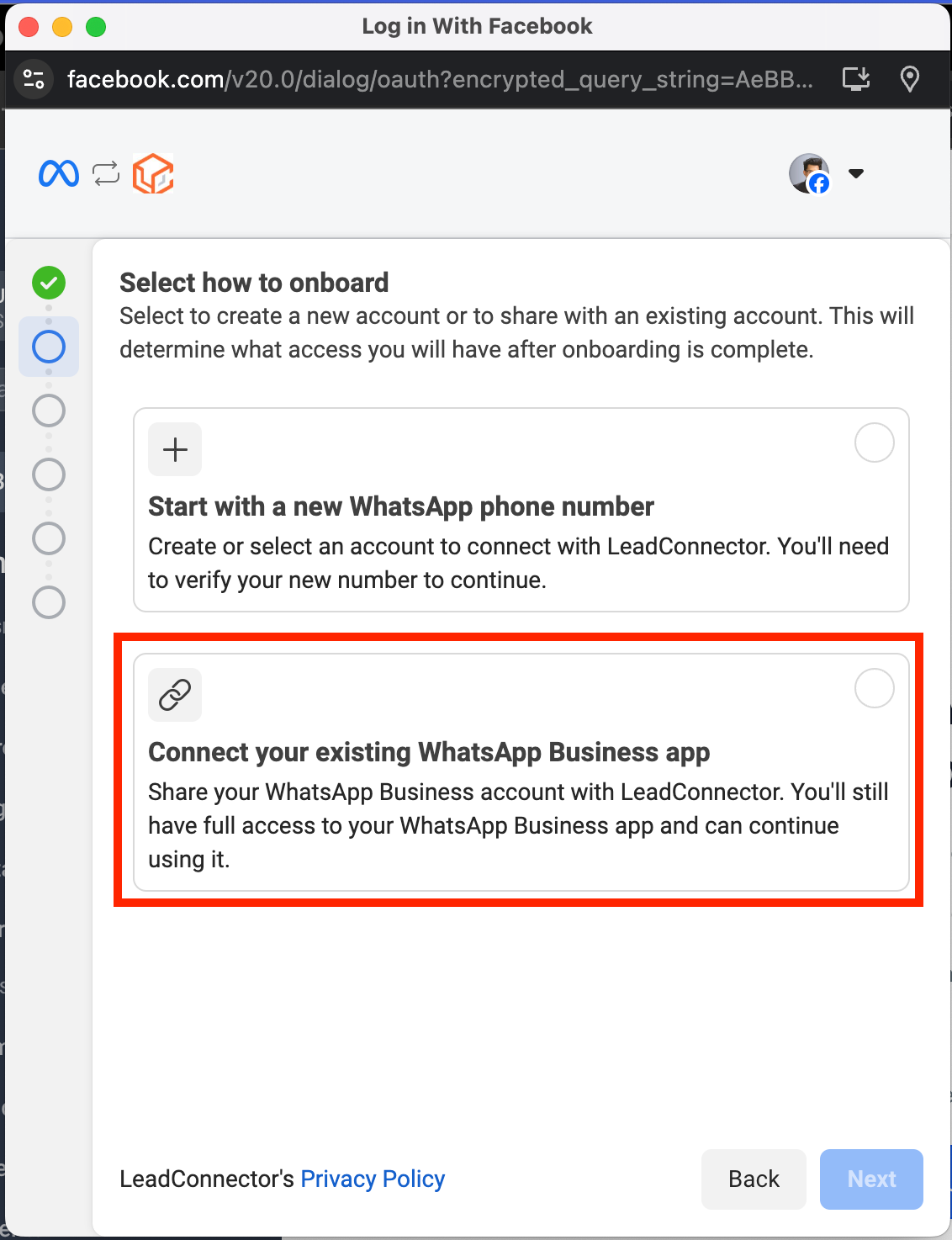 Connect your existing WhatsApp Business app Share your WhatsApp Business account with LeadConnector. You'll still have full access to your WhatsApp Business app and can continue using it
