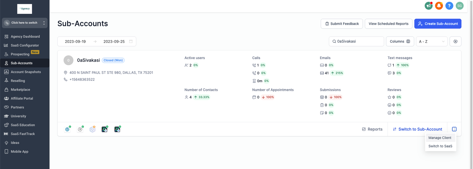 Step 1: Go to Sub-Account List -> search for Client -> Click on three dots -> Manage Clients