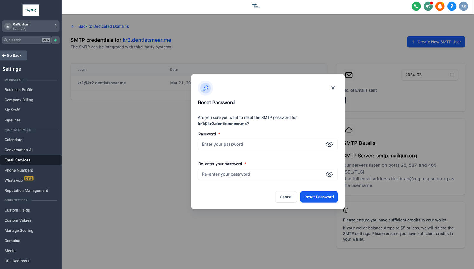 SMTP credentials can be created in sub-accounts level(not the agency-assigned domain) not at the agency level.