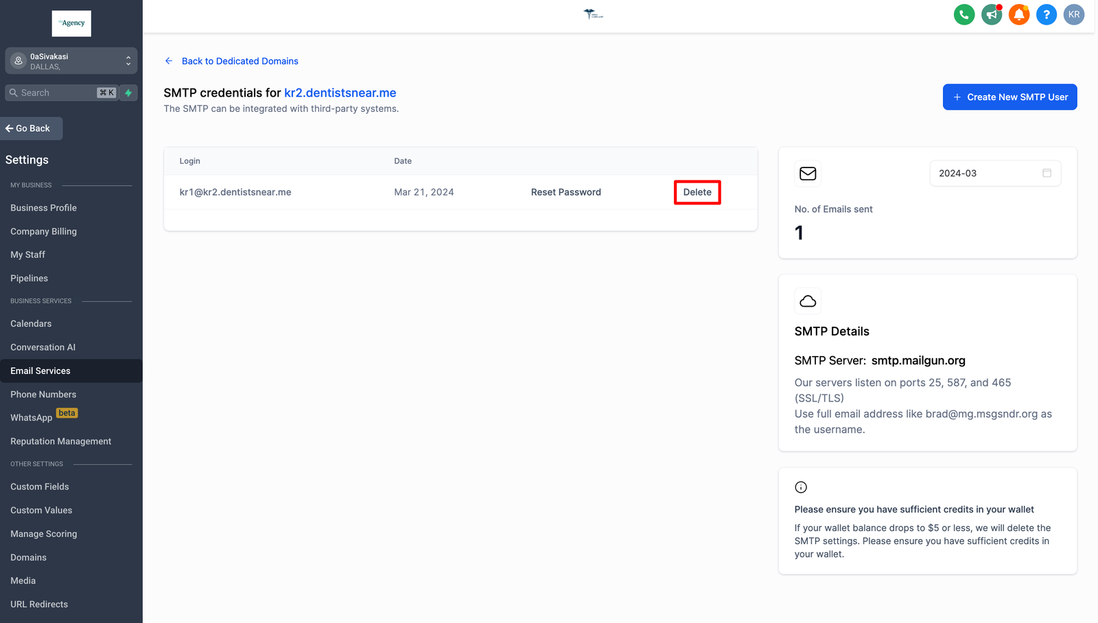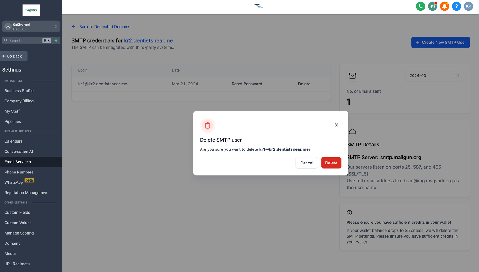 To Delete the SMTP credential, kindly click on the “Delete” button located in the pop-up modal.