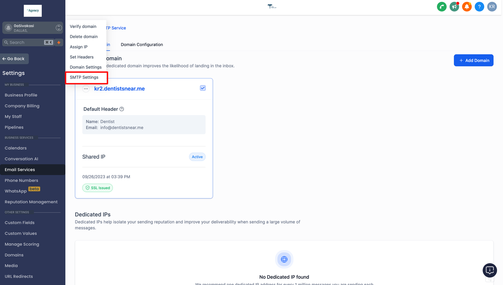 Email Service -> SMTP Service -> Dedicated Domain and IP -> SMTP Settings under dedicated domain.