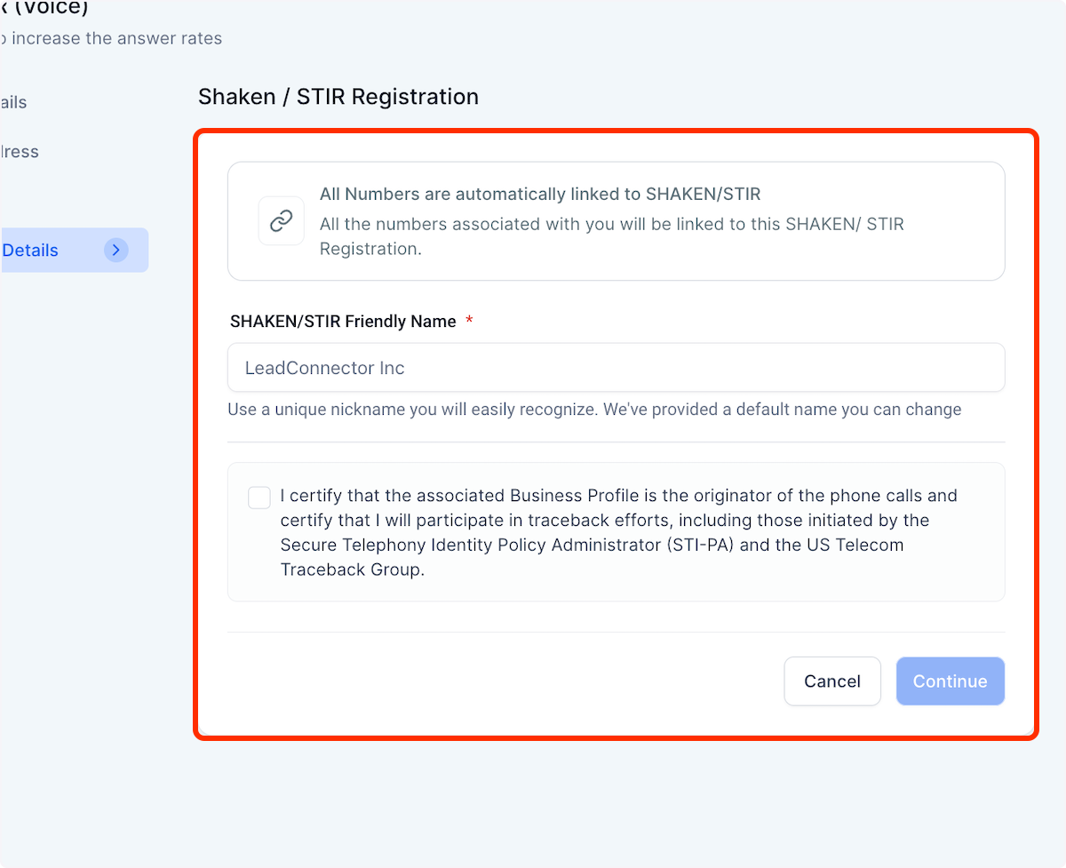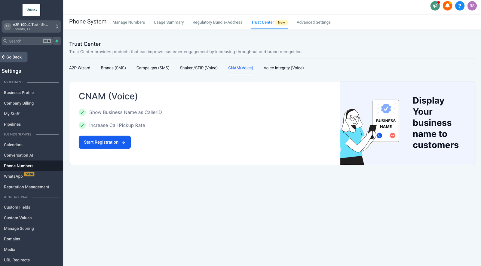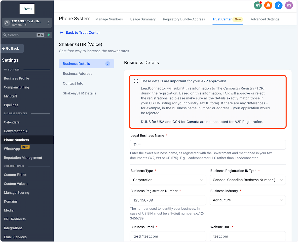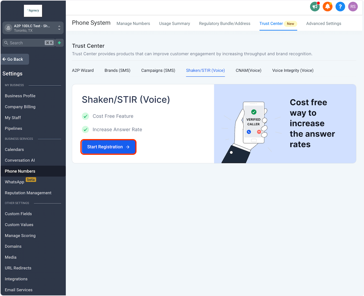 After submitting their Business Profile, Agency and Sub-account admins can register for SHAKEN/STIR.