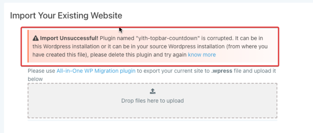 Plugin named “yith-topbar-countdown” is corrupted. The Error can be in this WordPress installation or it can be in your source WordPress installation (from where you have created this file), please delete this plugin and try again. Once you have done that if the file is corrupted too then the error will change and show the file corruption error discussed above, you can then delete the file and try again in that case.