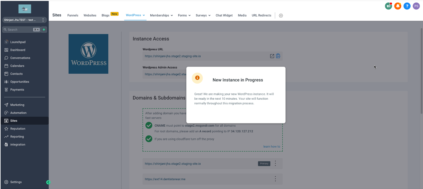 2. After confirming the migration, our new infrastructure will create a WordPress instance specifically for your WordPress sites. This process typically takes around 10 minutes to complete. Our system will set up the necessary components and configurations during this time to ensure a seamless transition to the new infrastructure.