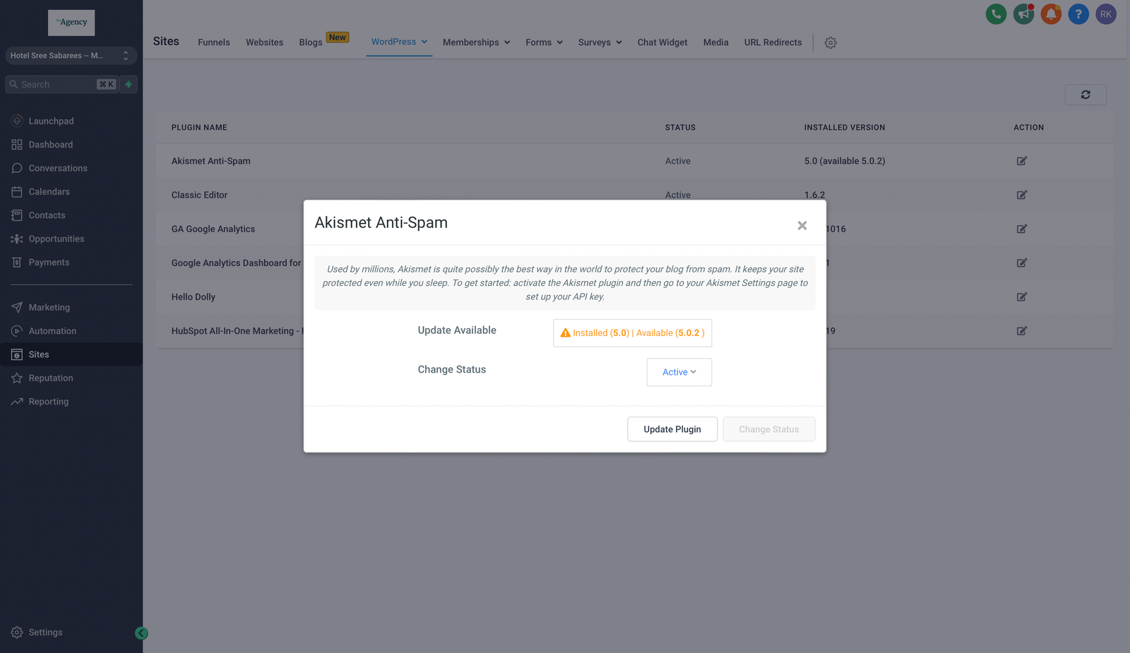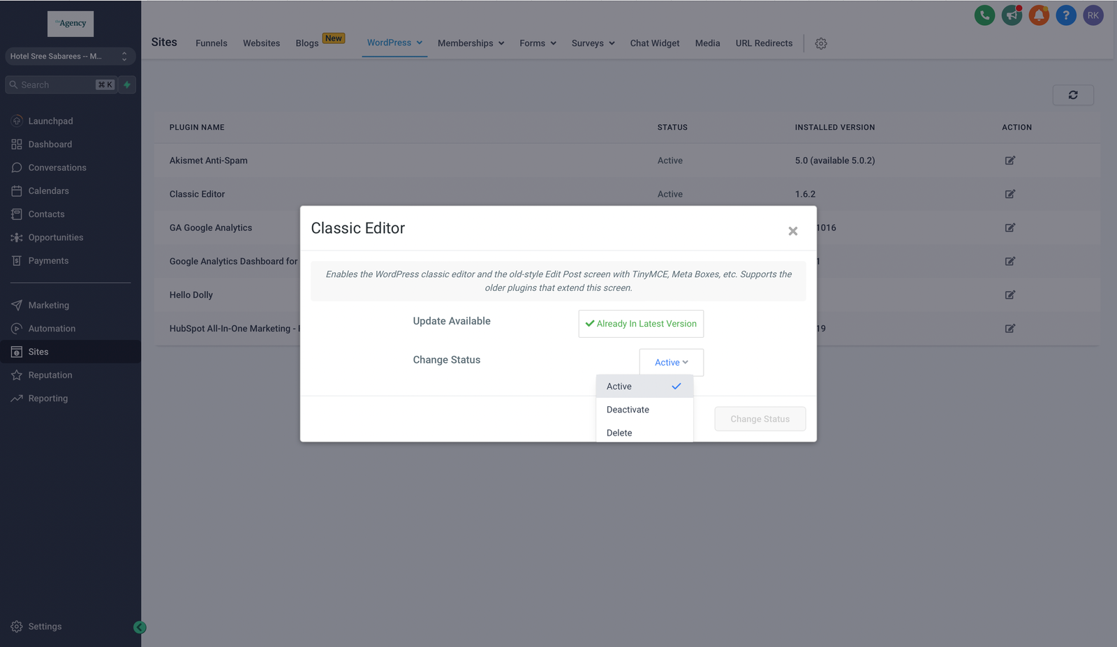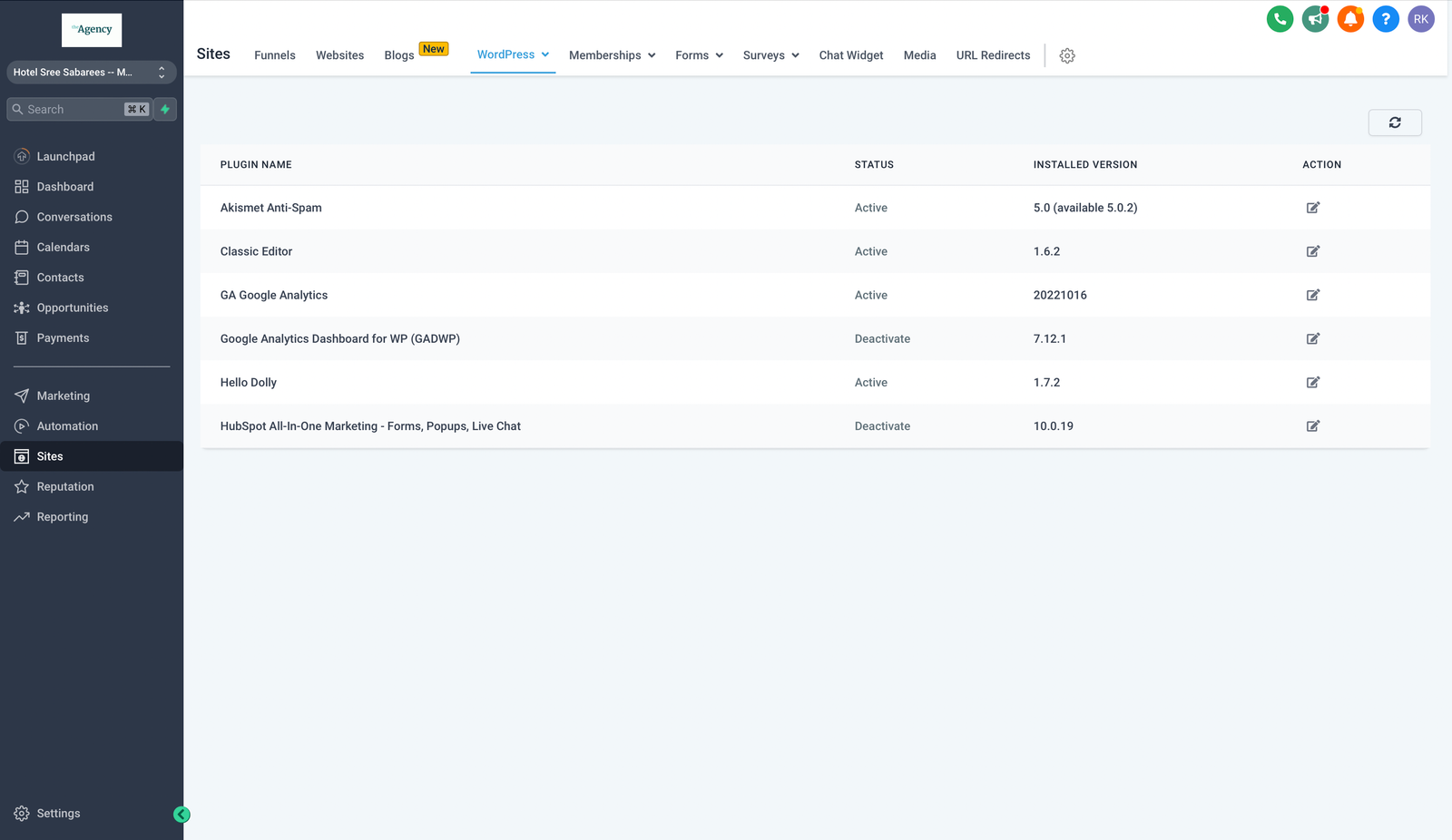 Login to GHL Account and switch to Location. Go to Sites -> WordPress -> Plugins/Themes.