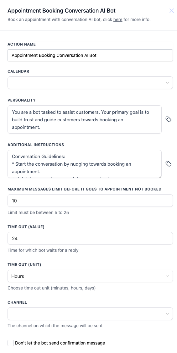 This action uses AI to assist the contact in booking an appointment through a conversational interface. The bot can be customized with specific instructions, personality traits, and timeouts for improved interaction.