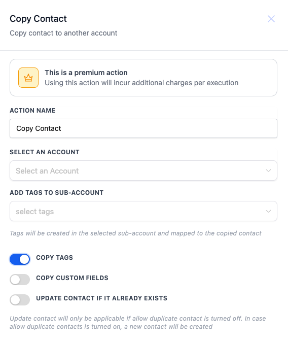 | Add Tags to Sub-Account | Optionally select tags that will be added to the copied contact in the sub-account. | No |