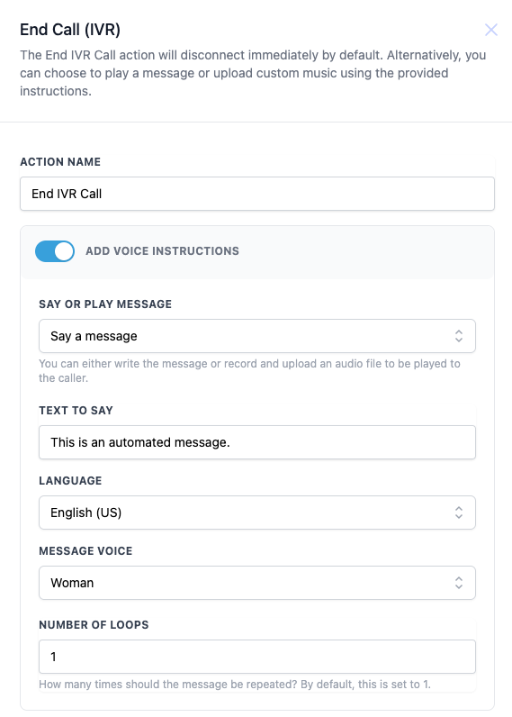 Add Voice Instructions Toggle to enable or disable adding a final message before ending the call No