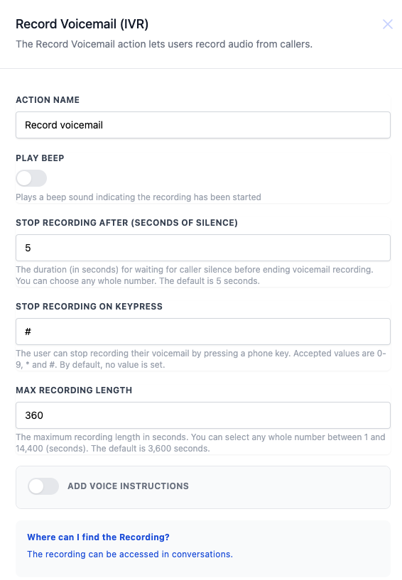 The Record Voicemail (IVR) action allows users to record audio messages from callers. This feature enables callers to leave voice messages during the call flow. You can also configure the message to end automatically after a period of silence, on keypress, or when the maximum time length is reached. The recorded voicemail can be accessed within the conversation section.