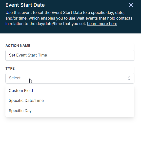 Once this action is set, you can use the “Wait” steps in your workflow to Wait for Event/Appointment Time to pause the execution until a specified time relative to this event date. For example, you could set up reminders to go out several days before an event or schedule a follow-up action for several days after the event.