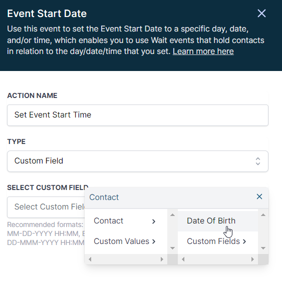 The "Set Event Start Date/Time" action often allows you to use a variety of date and time formats.
