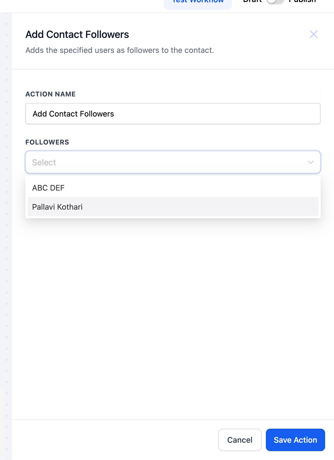 - Add Contact Follower – The Add Contact Follower action is added to the workflow and the follower is selected from the dropdown.