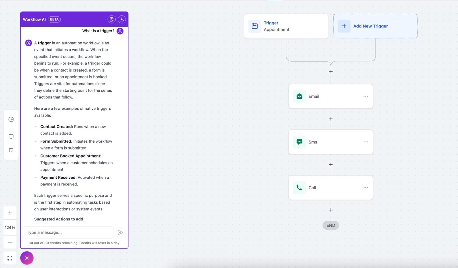 It can even help you add specific actions—like sending an SMS reminder, waiting for confirmation, updating an appointment status, or tagging contacts based on activity.