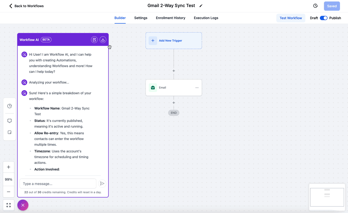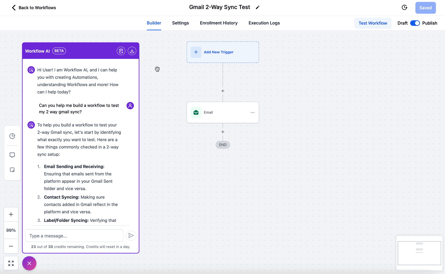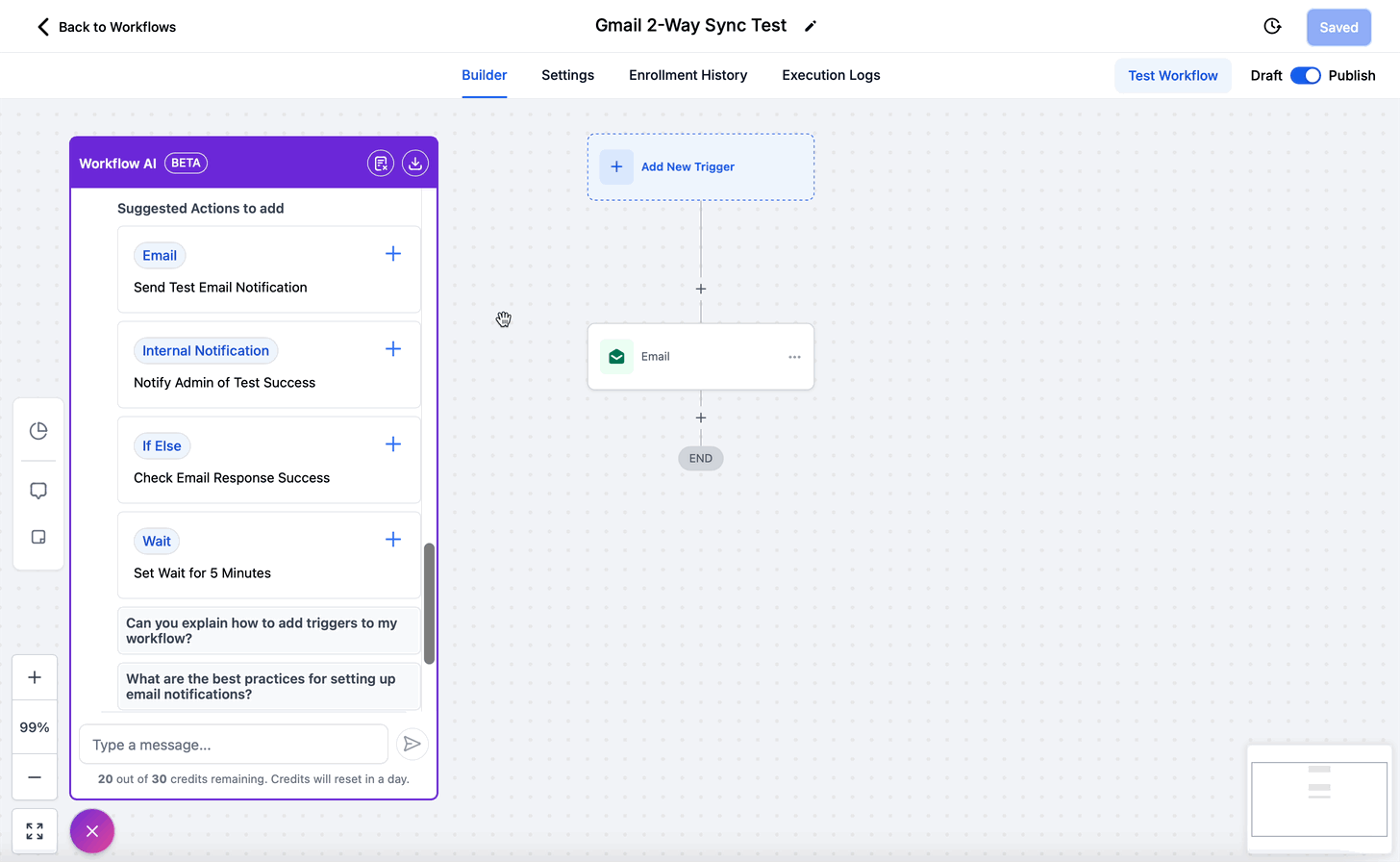 If you are new to workflows, you can just mention what you want to achieve and Workflow AI will give you the actions and triggers you need to add and help you configure the same. AI Assistant can also explain what are workflows and how to use them.