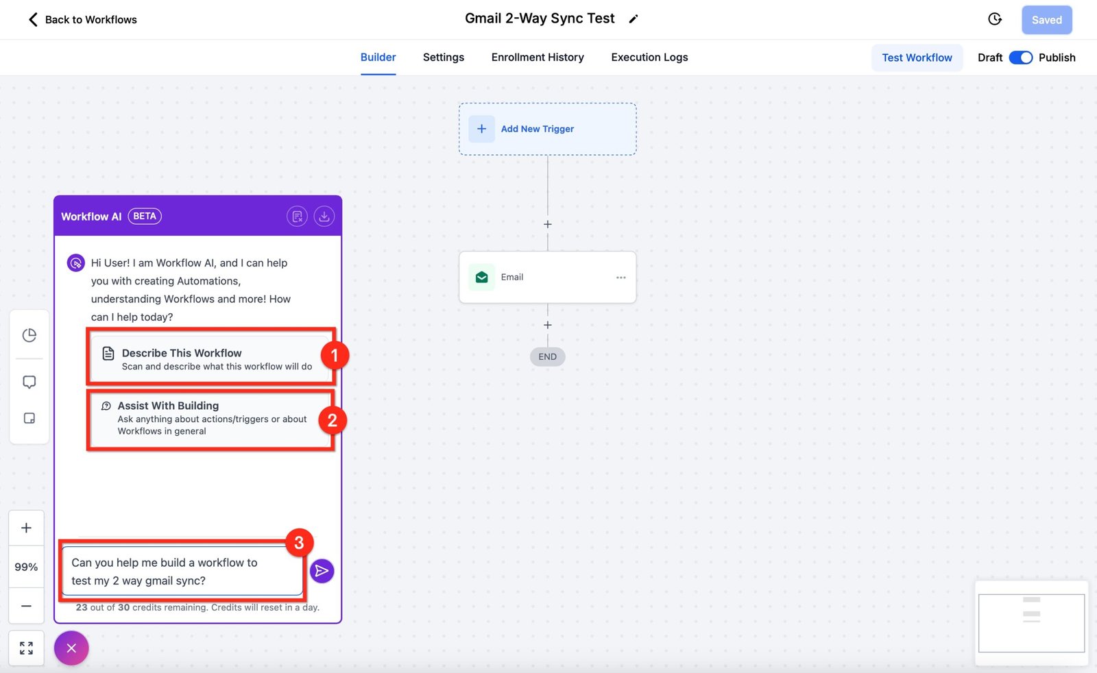 - Help Building: Click the “Assist with Building” button to get suggestions for your workflow from Workflow AI.