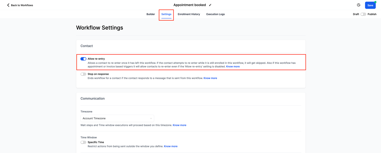 This setting determines whether a contact can re-enter the workflow once completed or removed. Enabling ‘Allow Re-Entry’ permits a contact to revisit a workflow, provided they are not currently active. By default this setting is turned “On” in the workflow