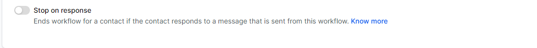 This feature allows a workflow to be interrupted and end for contact as soon as they respond to a message sent from the workflow. This setting is handy when further progression in the workflow depends on the recipient’s response or when you don’t want to overwhelm your contact with further messages after they have replied.handy additional