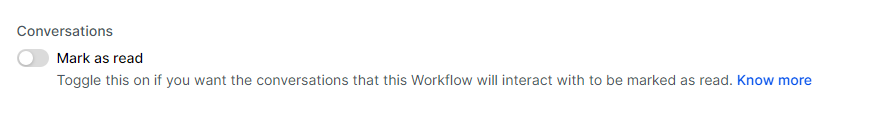 This setting controls whether or not automated messages sent from a workflow are automatically marked as read in the conversation tab. By default, messages sent from a workflow appear as unread. If the ‘Mark as Read’ setting is enabled, all outgoing automated messages are automatically marked as read, helping to maintain a clean and organized conversation tab.