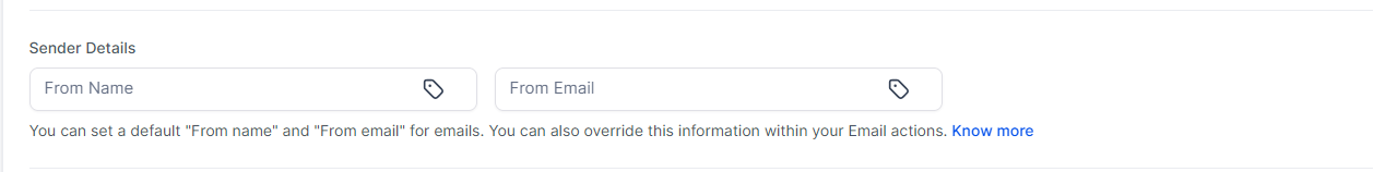 Email: You can set a default from name and email address for your emails, although this can be changed by specifying from name and email in the email actions.
