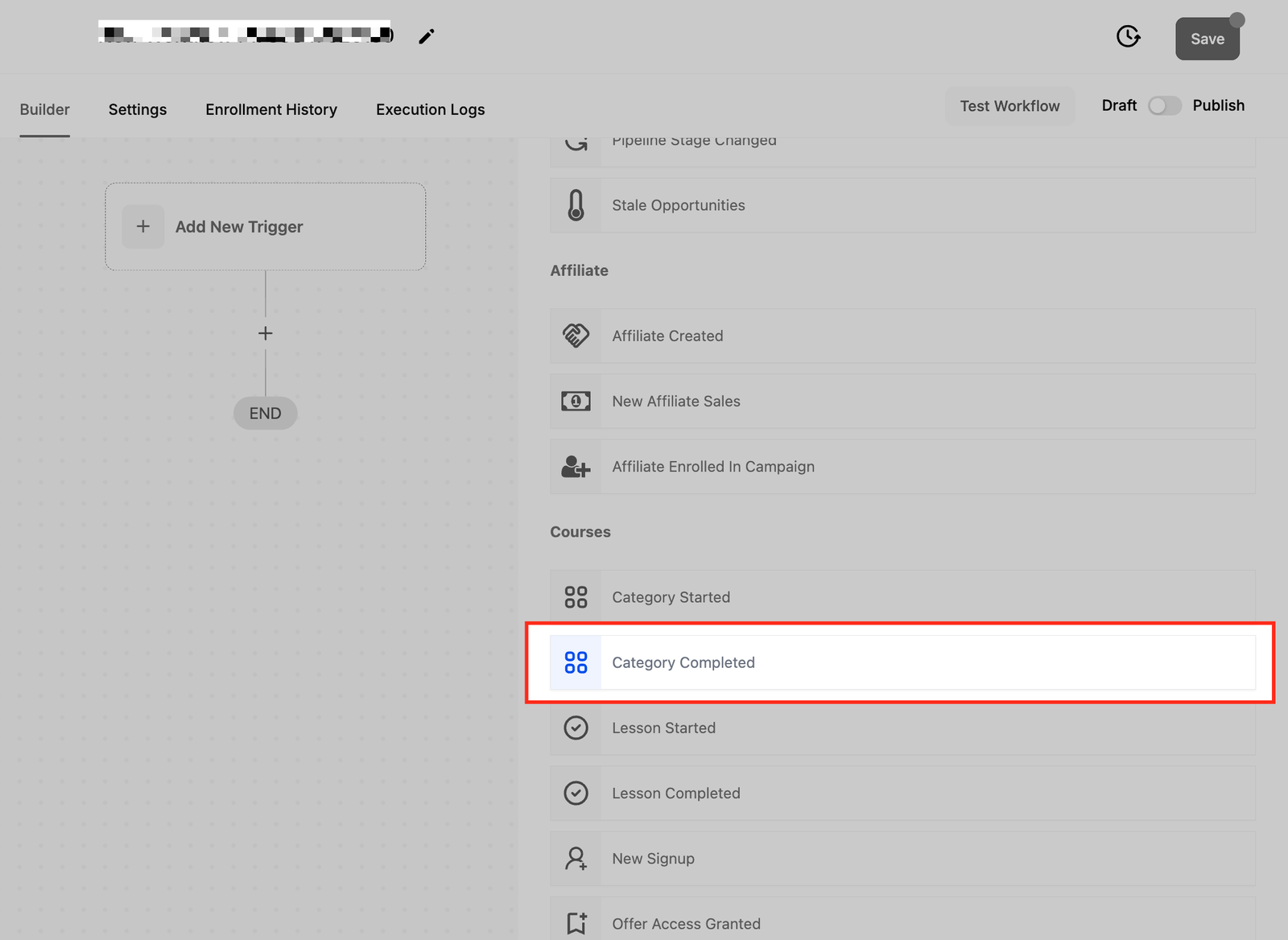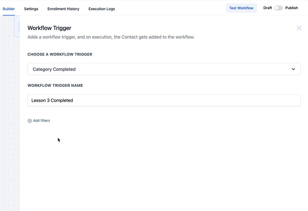 The Category Completed trigger initiates a workflow when a contact completes a specified category of products or courses. It’s particularly valuable for tracking user progress and automating follow-up actions such as sending completion emails, issuing certificates, or recommending next steps. With optional filters, this trigger ensures workflows are activated only when relevant categories are completed.