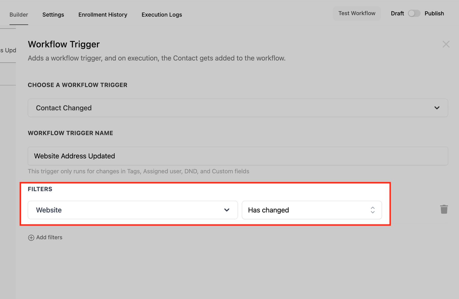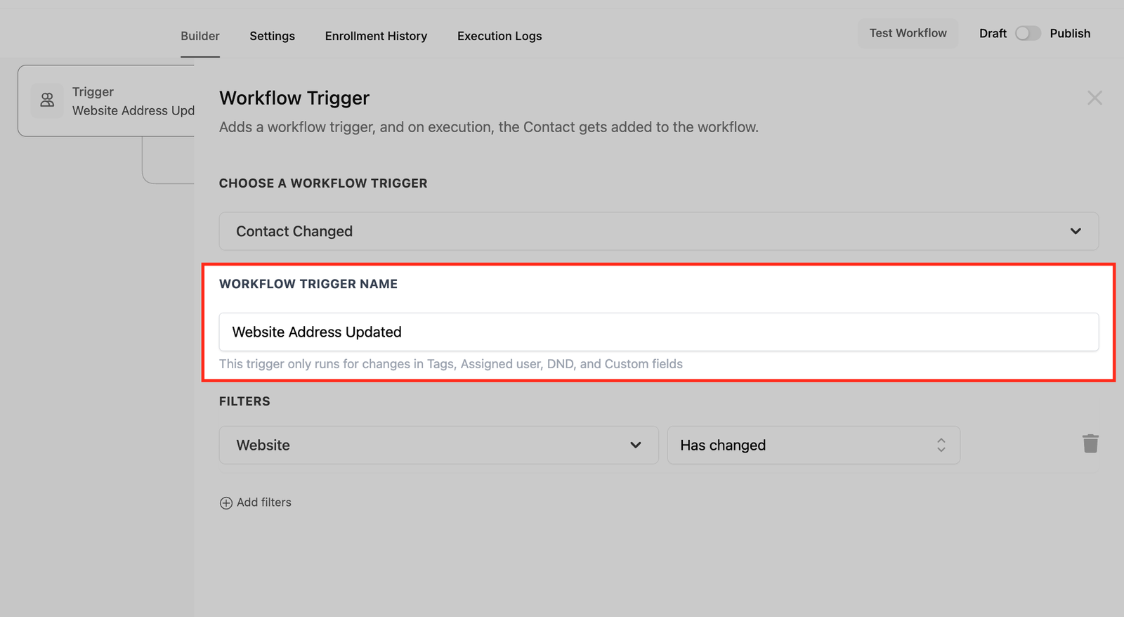 - Name the Trigger: Give it a descriptive name, like “Website Address Updated.” Set Filters: