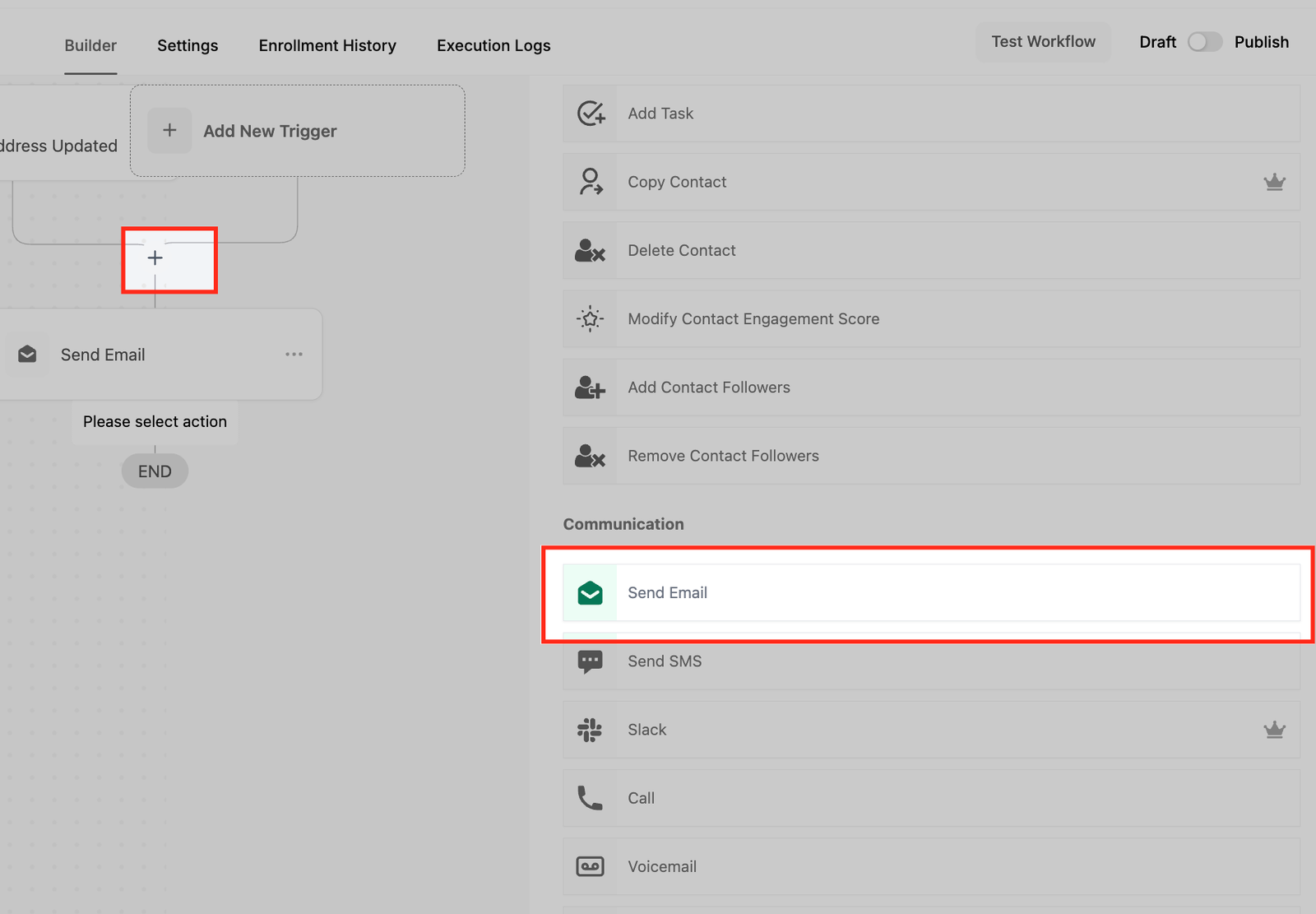 - Once the trigger is set, define what happens next. To set the workflow action, click the "+" icon and scroll down to find "Send Email" action.